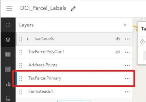 Open the Map Viewer, and select the Layer that will have the expression applied to it. In this example, the “TaxParcelPrimary” layer will be used.