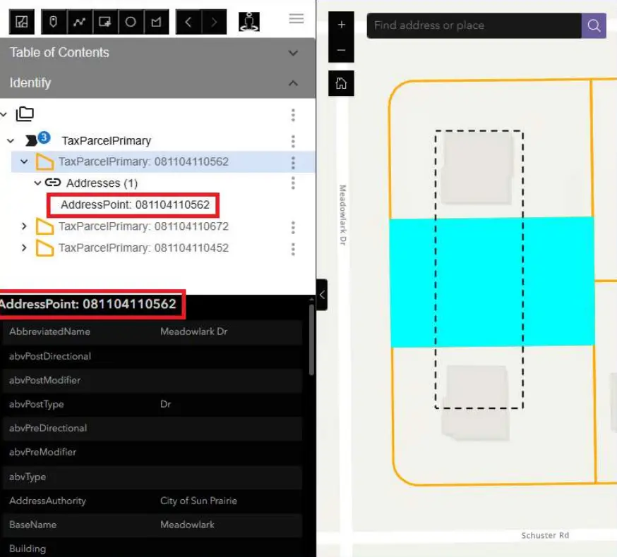 We told our xbUI tool that, when we select a feature under the “TaxParcelPrimary” feature layer, we want the “AddressPoint” feature related to our selected feature to be attached as well. This gives us the ability to view attributes not only of our selected feature, but the related feature as well.