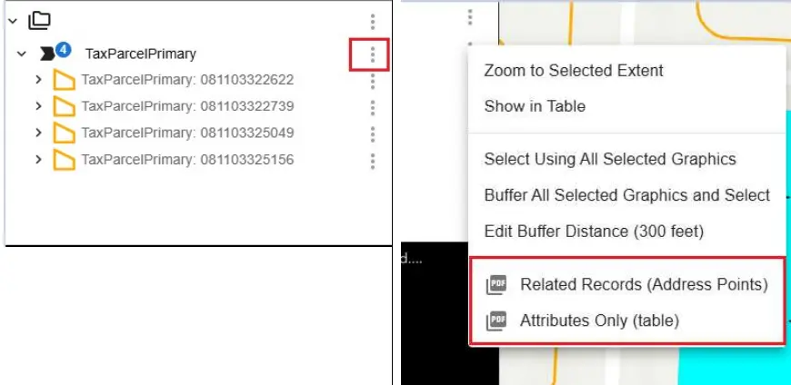 If all was done correctly, we can create a selection, populate our Identify panel and this time, we will hit the three dots adjacent to the parent layer we have selected. This is where we will find options to export our selection as either “Related” or “AƩributes Only” PDFs.