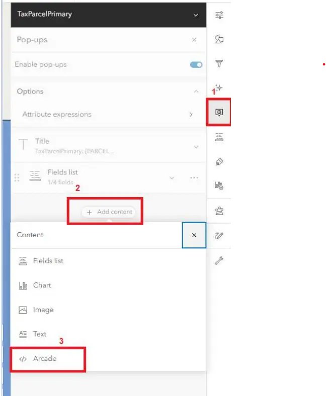 Once the layer we would like to use is determined, select the “Pop-ups” icon on the right (1).